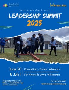 Join the Youth Leadership Council for a dynamic two-day Youth Leadership Summit on June 30 and July 1, 2025, from 9:00 AM to 3:00 PM each day. Open to area youth ages 13–18 and any member of the Windham Prevention Coalition Youth Leadership Council, this summit brings together emerging leaders for an engaging experience packed with team building, outdoor challenges, and real-world leadership practice. Designed specifically for members of the Youth Leadership Council, the event will empower participants through youth-led problem-solving dialogues, high-energy group activities, and skill-building sessions that inspire confidence and community action.